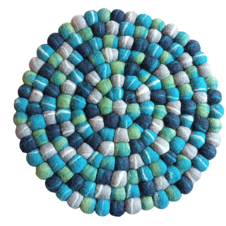 Elevate your home décor with the Green Taidai 30cm Round Felt Ball Mat, a stunning handcrafted piece from Nepal. Measuring 30cm x 30cm, this round mat is meticulously hand-felted using 100% New Zealand wool, ensuring exceptional durability and a luxurious texture. Each mat is composed of 2.2cm diameter felt balls, intricately connected through a specialized knotting technique, creating a robust and visually captivating design.