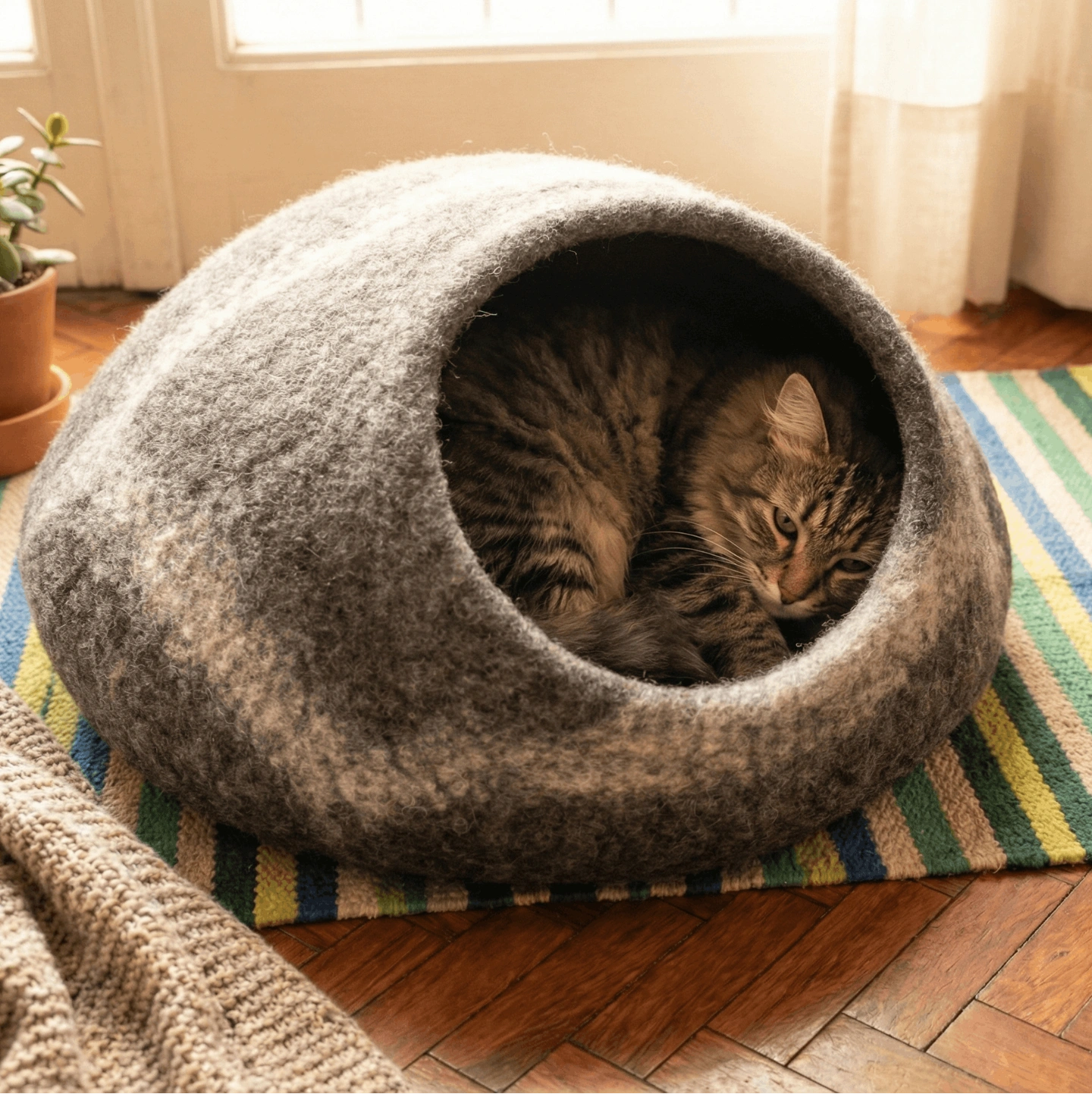 Our Cat House is Hand felted in Nepal using 100% wool.These Cat House are made using o f felting technique by our local artisans.Soft and durable wool,your cats & snmmall pets wiil cool in the summer and warn=m in winter.After receiving your cat house,open the cat house and let sit for 24 hours for its proper shape.Due to every cat house is handmade and it occurs little difference in size,colors and its shape