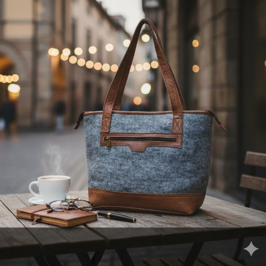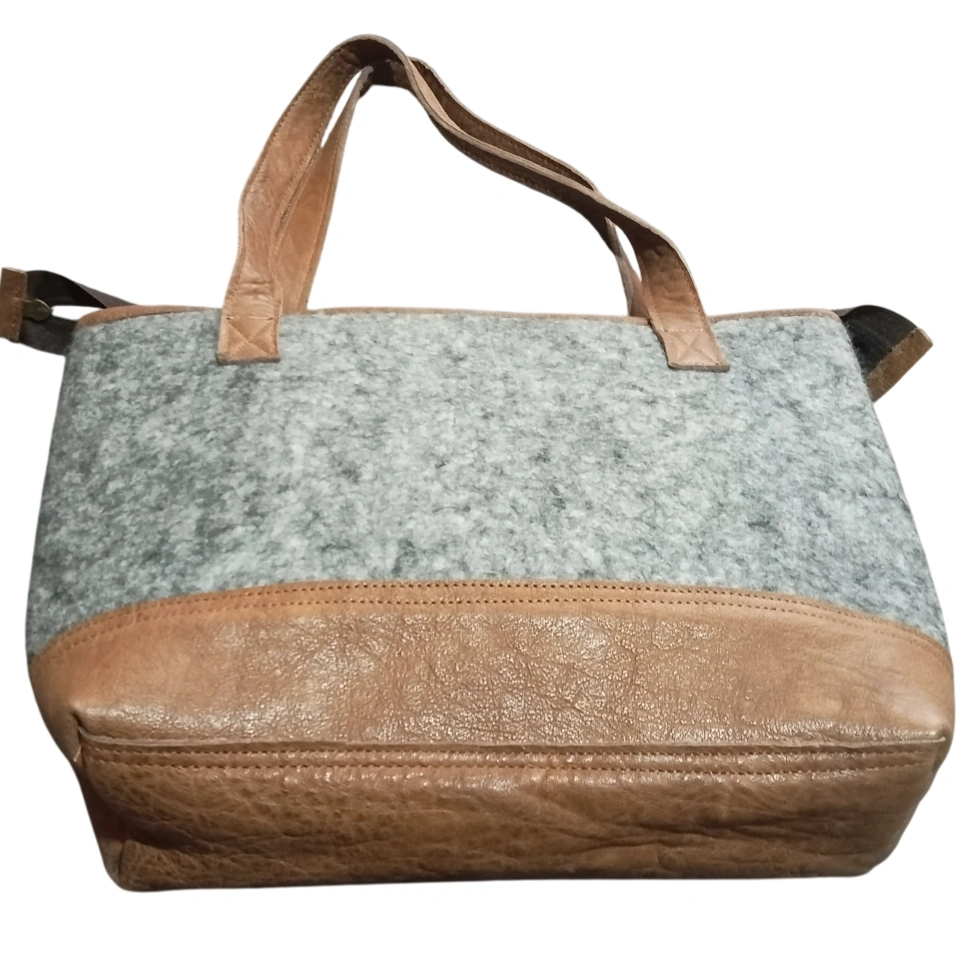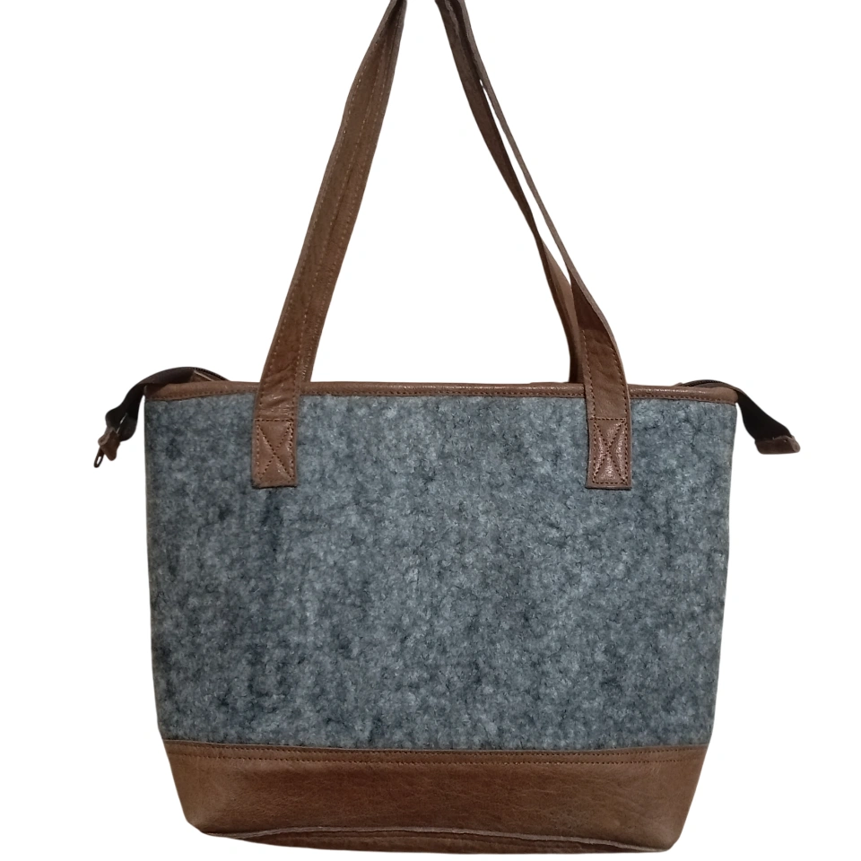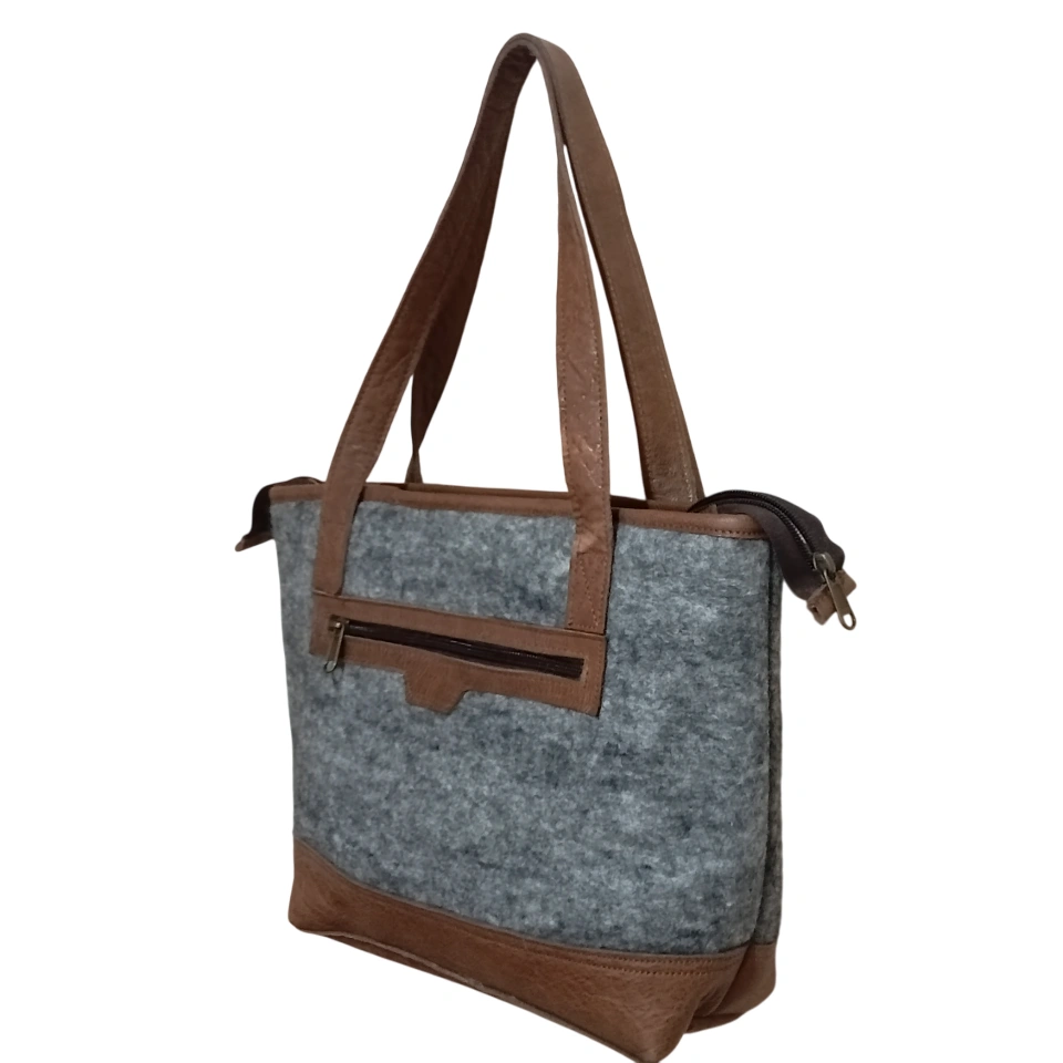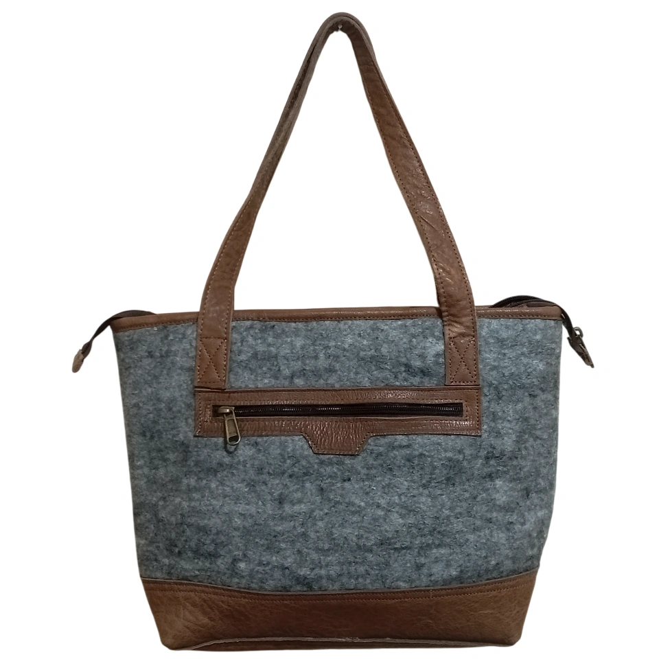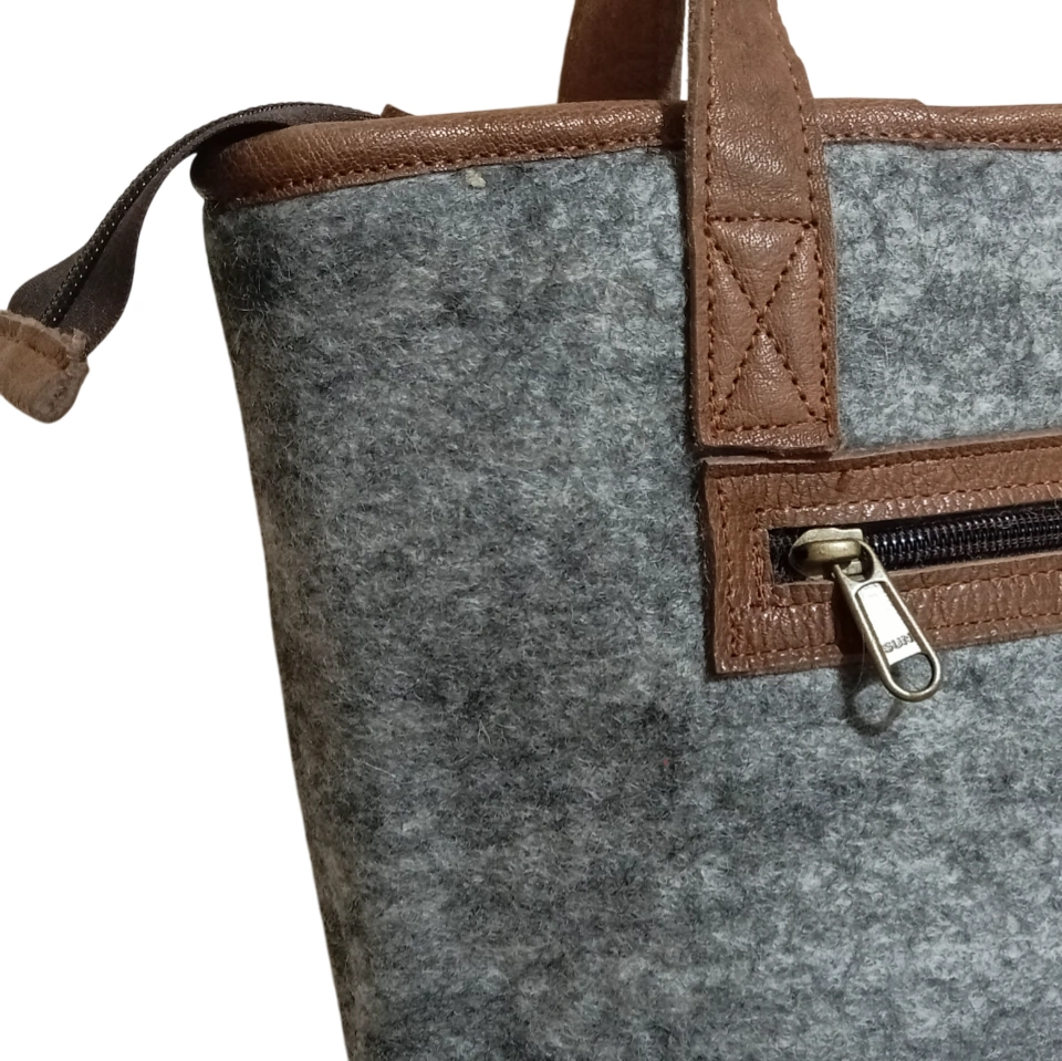 Nepali Felt shoulder bags are robustly designed products made of 100% New Zealand wool Elevate your style with our Classy Felt Bag with Leather Design, a perfect blend of elegance and functionality. Handcrafted by skilled women artisans in Nepal, this bag combines 100% pure New Zealand wool felt with genuine leather accents, creating a timeless accessory that stands out. Whether you're heading to work, a casual outing, or a weekend getaway, its spacious 36x30cm interior keeps your essentials—notebooks, makeup, phone, and keys—organized with effortless style.