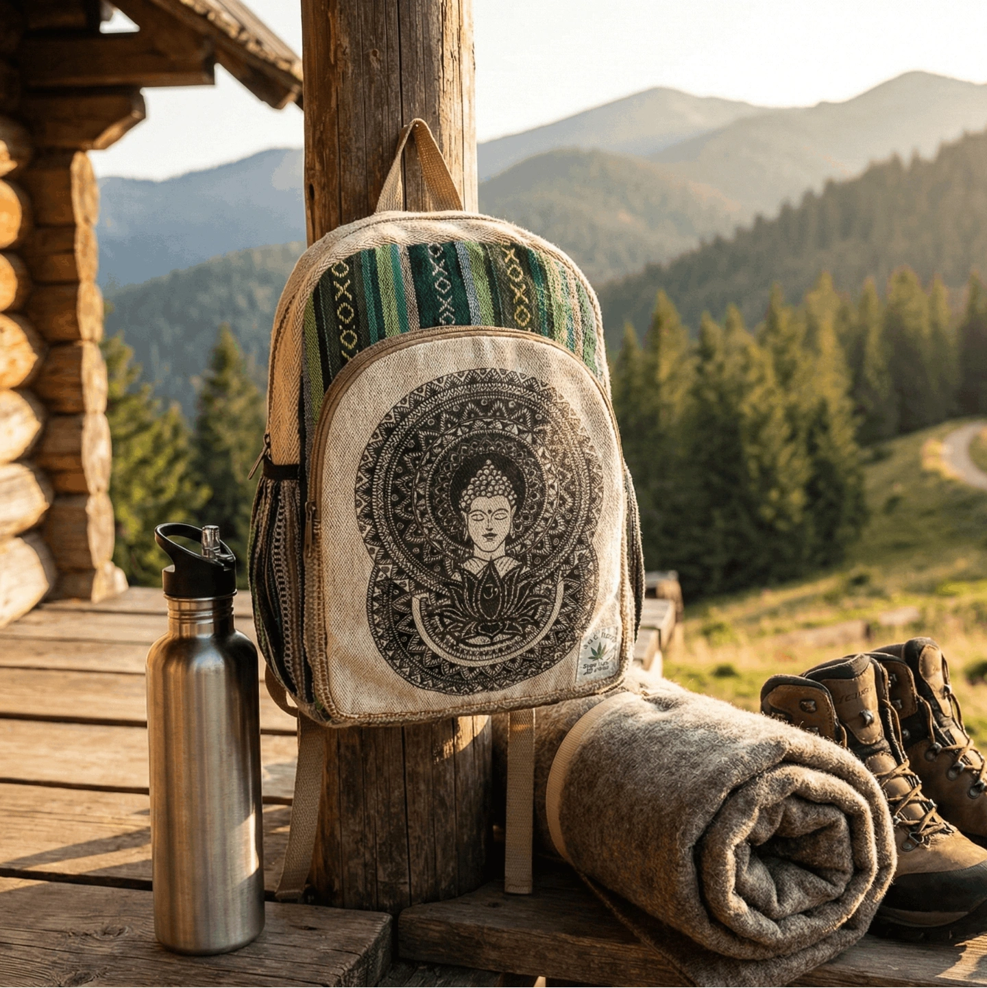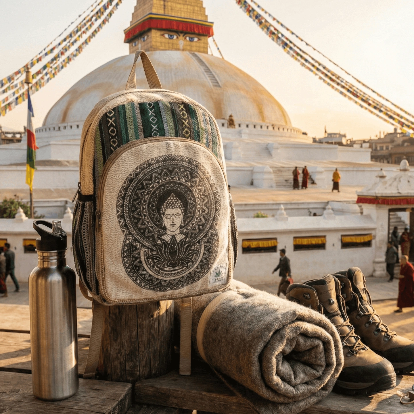 Artisanal Print: Features a unique " Buddha" design, handcrafted by local artisans in Nepal.