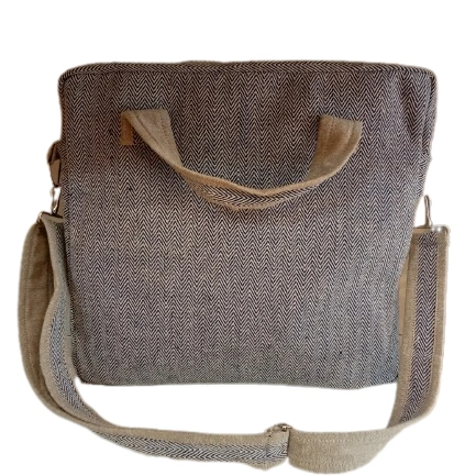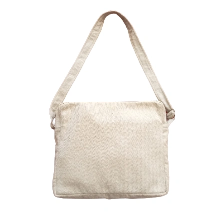 Our messenger bag is a blend of hemp and cotton, two eco-friendly materials that are durable and soft. It has a large compartment that can fit your documents and other essentials. The dimensions are 38 cm x 36 cm x 8 cm. Please note that each bag is handmade, so there may be slight variations in color, size, or stitching from the pictures. To keep your bag in good condition, we recommend hand washing it with cold water and avoiding bleach.