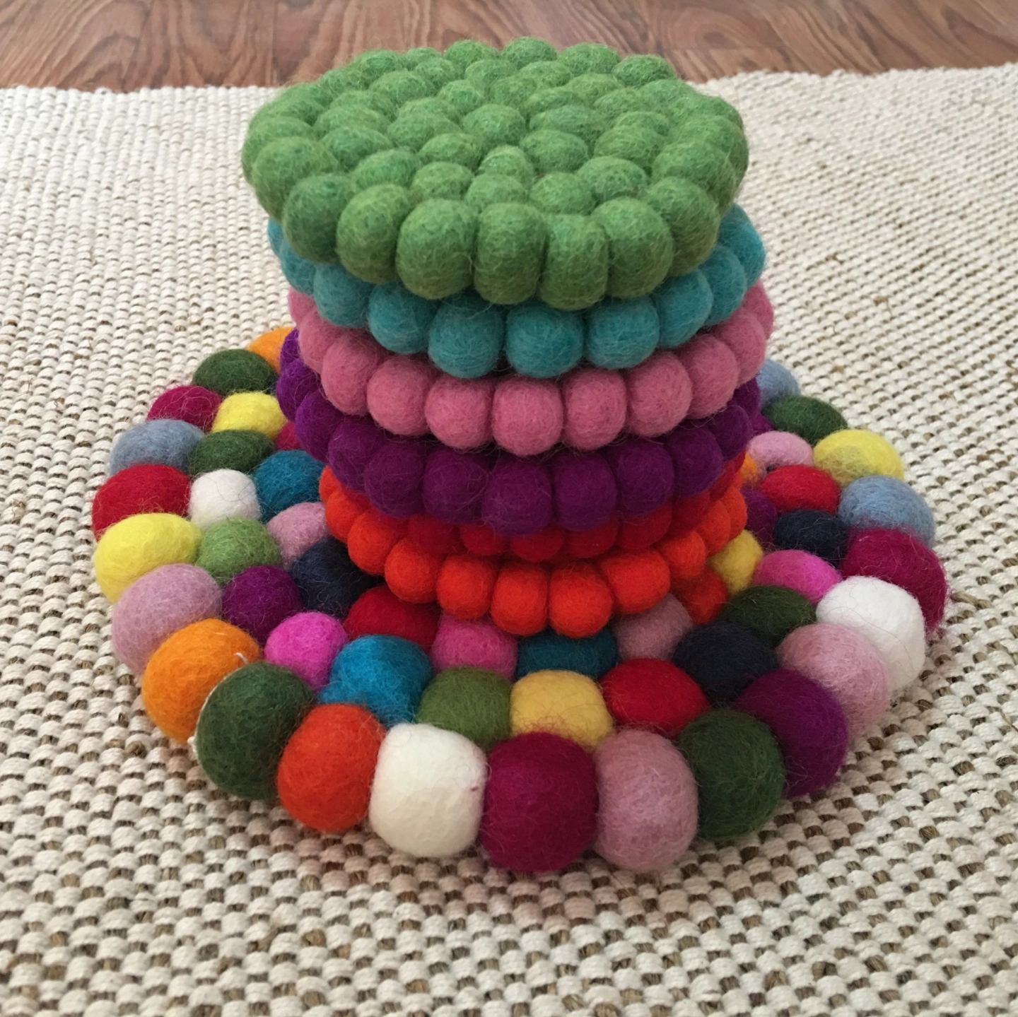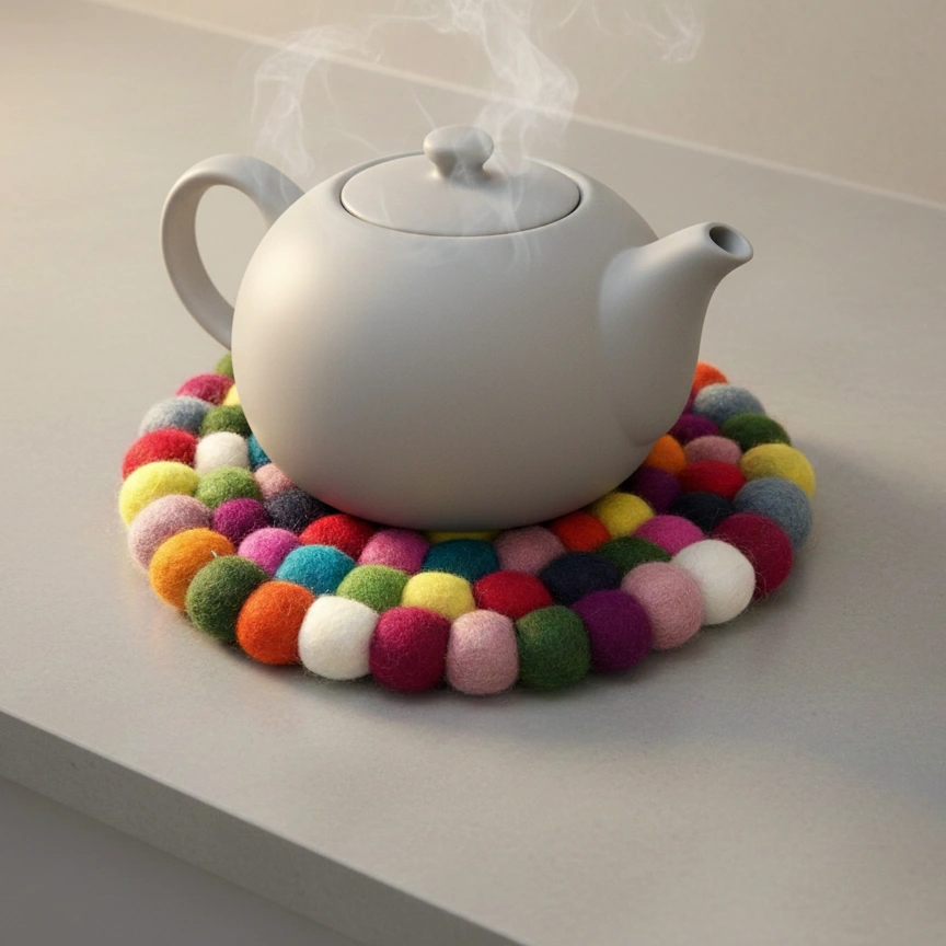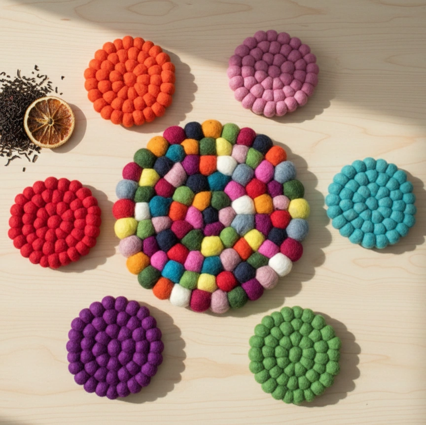 Hand-felted Trivet & Tea coasters are a charming addition to your home decor. Made from natural wool fibers, each Trivet & Coaster is crafted by hand, resulting in a unique and beautiful design. These coasters are perfect for protecting your furniture from spills and stains while enjoying your favorite cup of tea. Their soft and durable texture makes them a delightful and practical choice for any tea lover. Plus, they are easy to clean and maintain, ensuring long-lasting use.