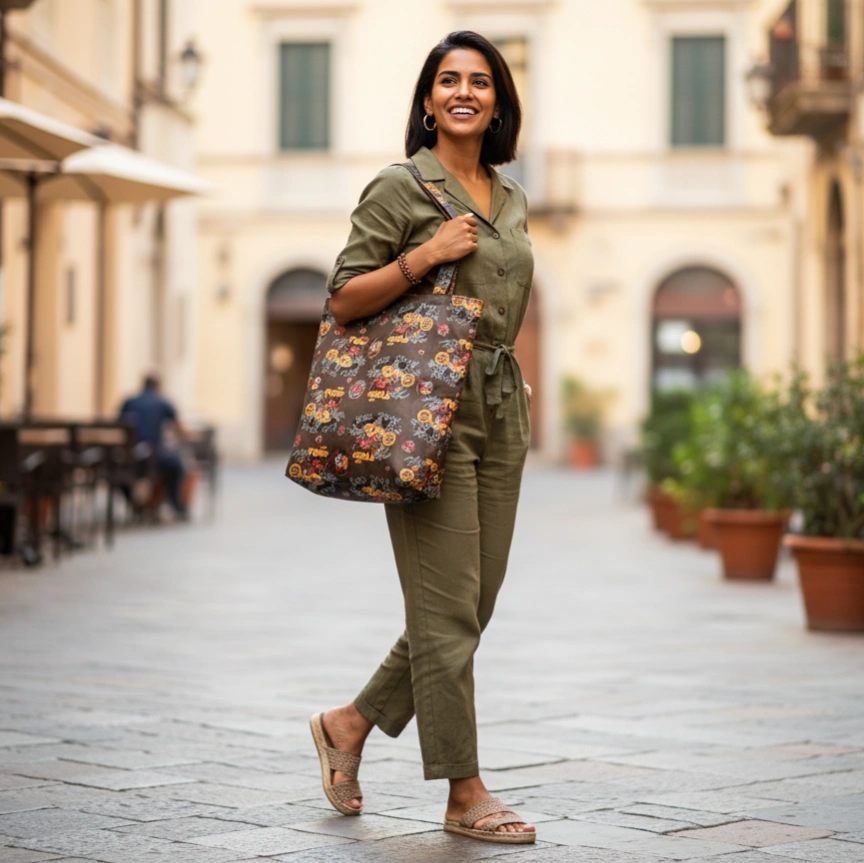 Elevate your style with our Floral Cotton Tote Bag, handcrafted in Nepal. This vibrant red tote, featuring a stunning floral design, is perfect for spring and summer. Made from durable cotton with a secure zipper closure, it offers two compartments for organized storage. Measuring 34 cm (upper width), 29 cm (lower width), 34 cm (height), and 9 cm (thickness), with 55 cm straps, it’s spacious enough for groceries, makeup, or school supplies. Ideal for shopping, beach trips, or daily commutes, this versatile bag combines practicality with bold aesthetics. Its eye-catching look makes it a great gift for floral-loving friends and family. Say goodbye to plain totes and make a statement with this chic accessory. Order now to experience the perfect blend of convenience and style!